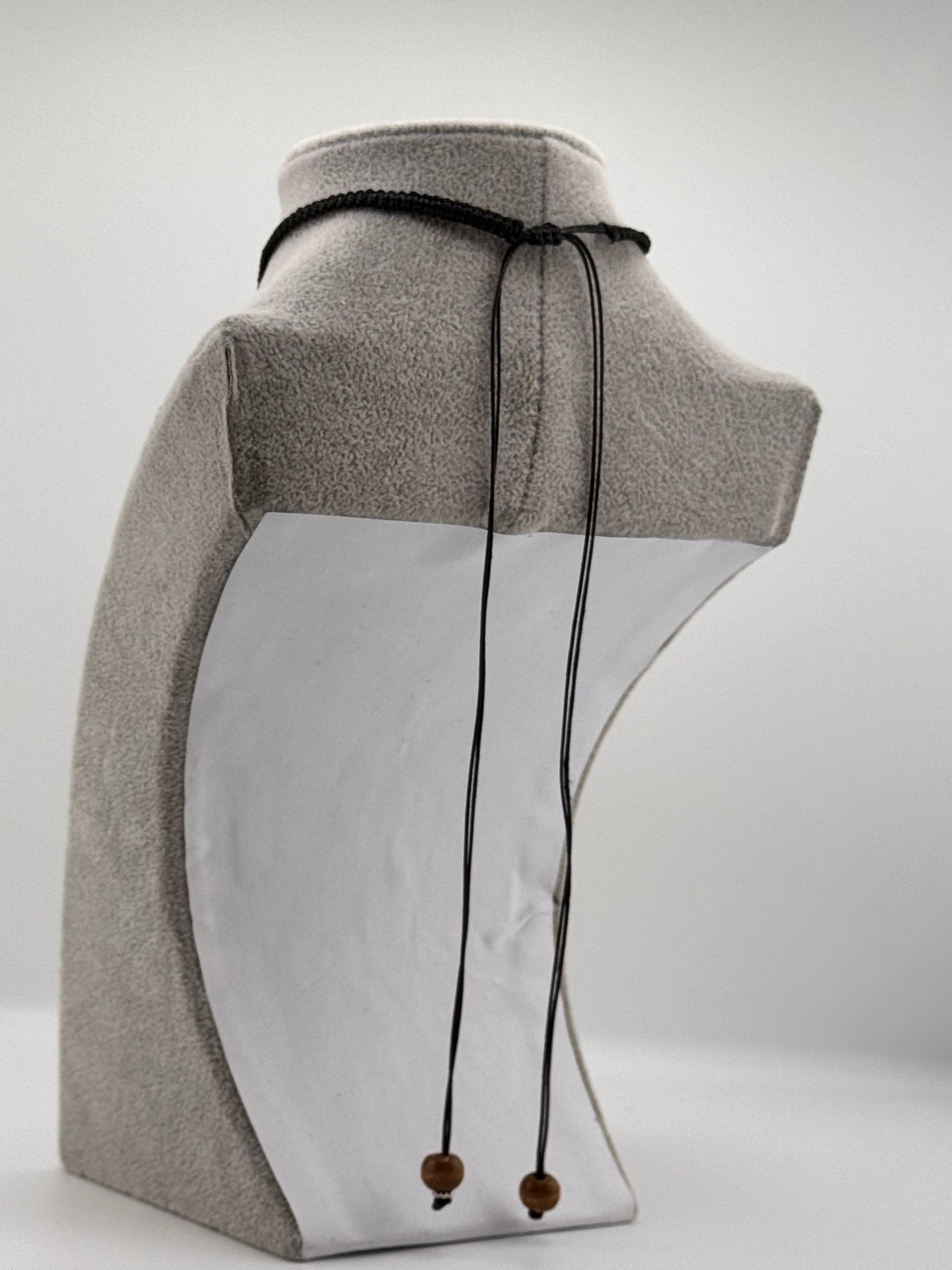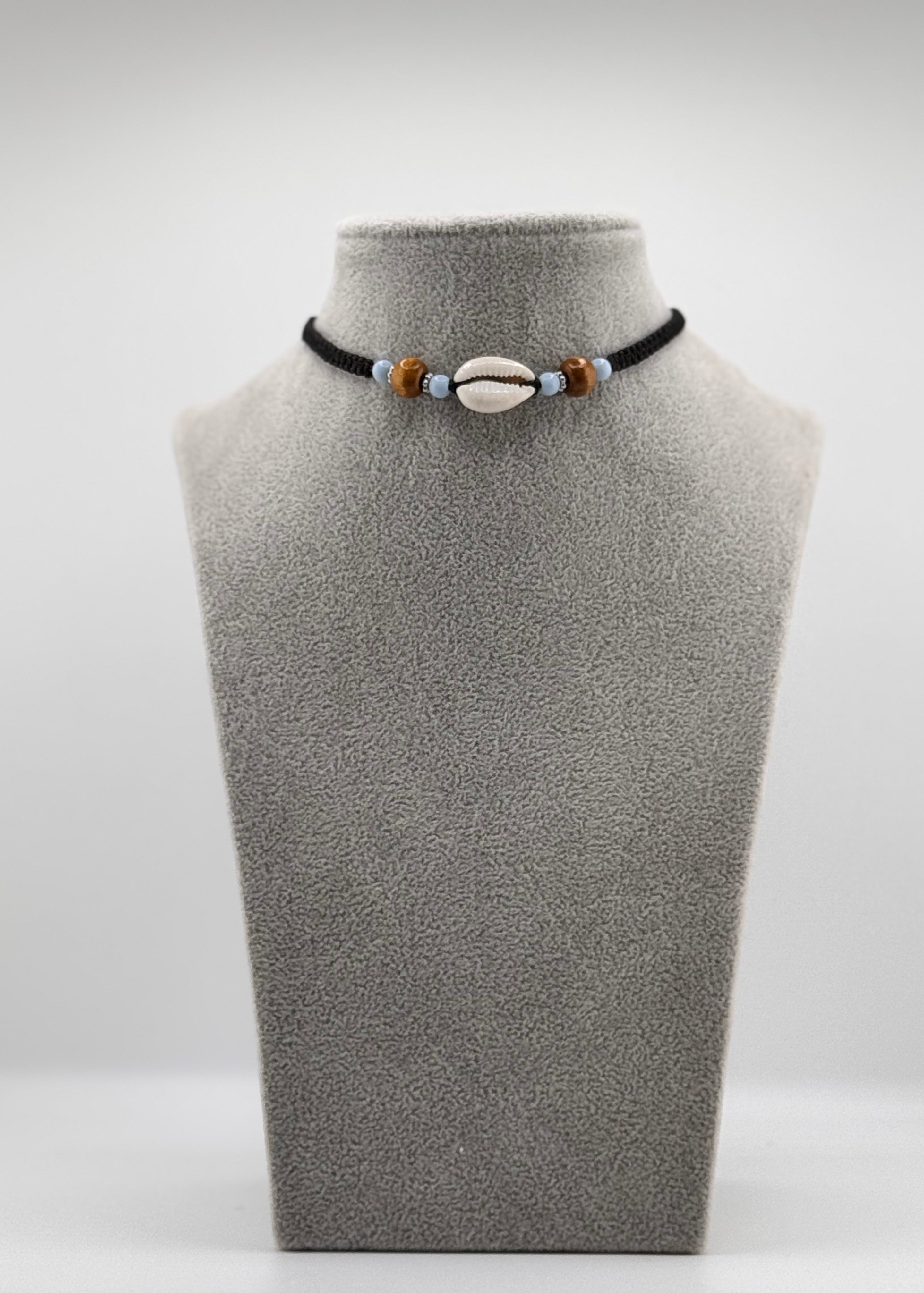 Diese elegante Halskette besteht aus einer zentralen Muschel und dekorativen, knopfartigen Elementen an den Seiten, die auf einem strapazierfähigen Stoff aufgezogen sind. Der zeitlose Look dieser Kette macht sie zu einem vielseitigen Accessoire für jeden Anlass. Leicht und angenehm zu tragen, verleiht sie deinem Outfit eine natürliche, maritime Note.