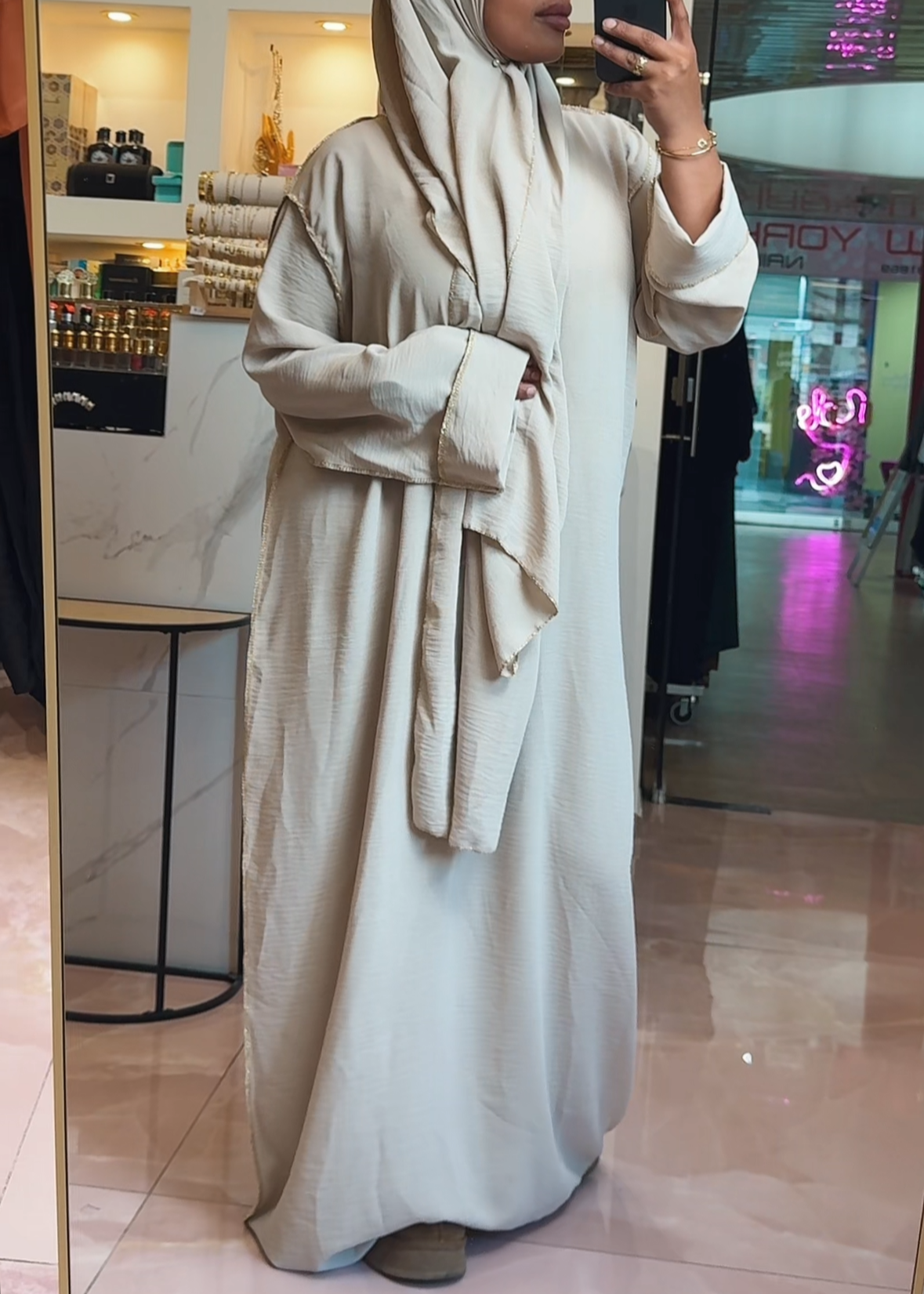 Die goldenen Nähte an den Bund verleihen dem Einteiler einen Hauch von Eleganz, perfekt für den Alltag und zum Beten. Der eingearbeitete Hijab bietet Komfort und eine mühelose, stilvolle Passform.