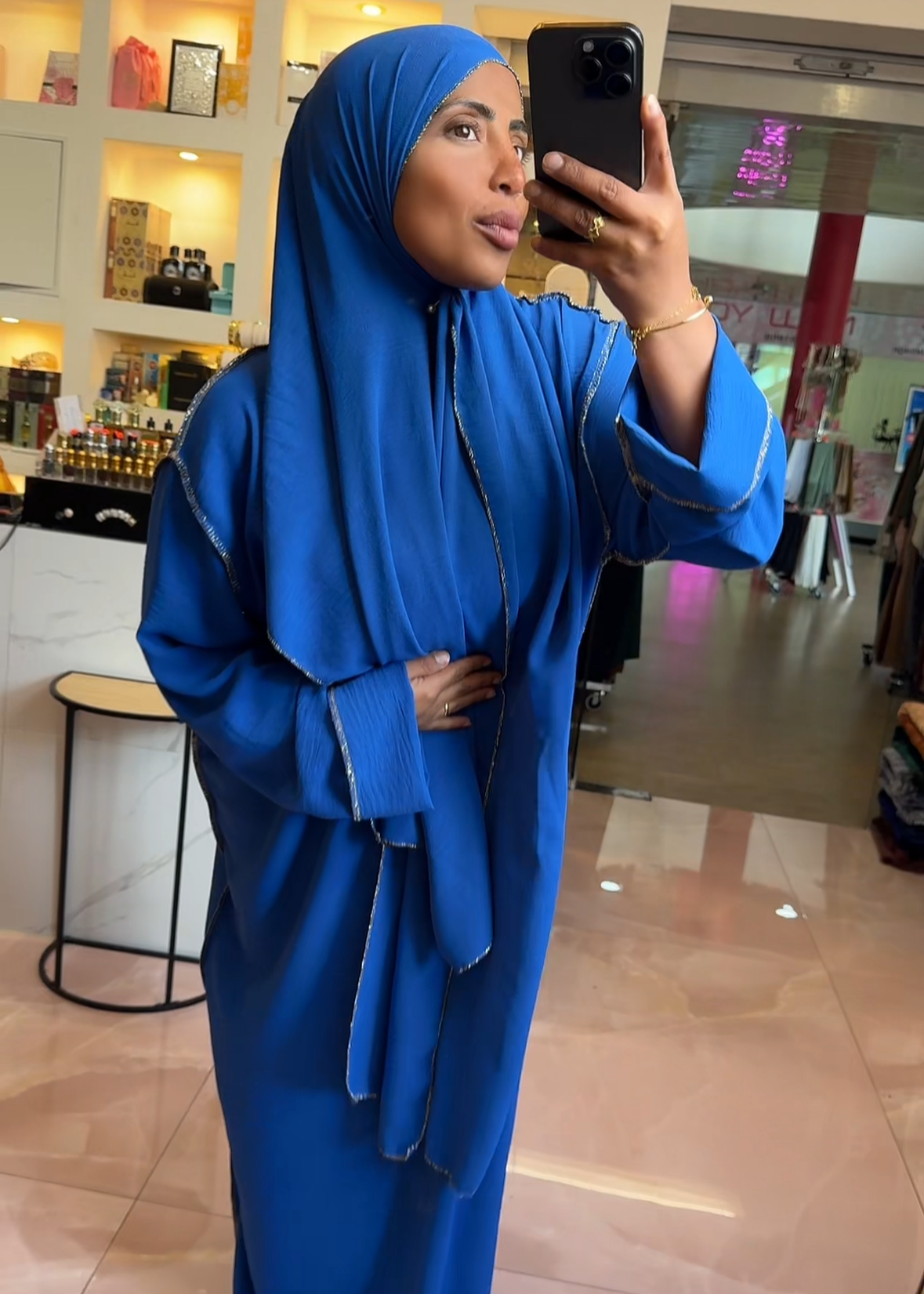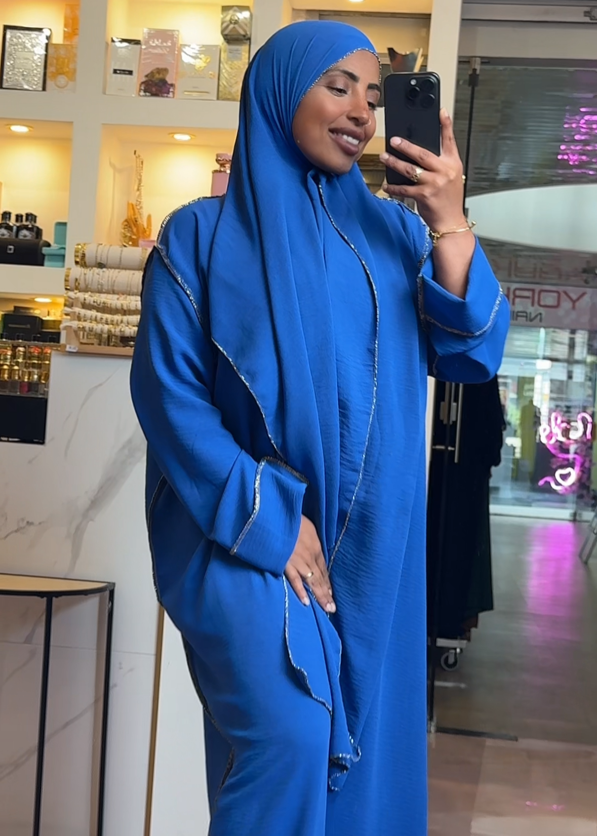 Die goldenen Nähte an den Bund verleihen dem Einteiler einen Hauch von Eleganz, perfekt für den Alltag und zum Beten. Der eingearbeitete Hijab bietet Komfort und eine mühelose, stilvolle Passform.