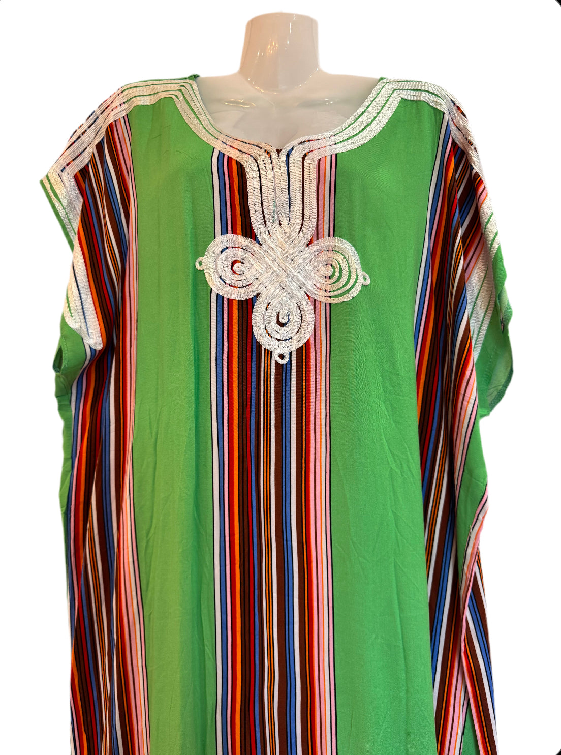 Verleihen Sie Ihrem Outfit mit unserem prächtigen gestreiften marokkanischen Kaftan (Gandoura) eine besondere Note, verziert mit exquisiter weißer Seidenstickerei. Das Kleid umhüllt Sie mit einem Gefühl von Leichtigkeit und Komfort und ist der ideale Begleiter für verschiedenste Anlässe: