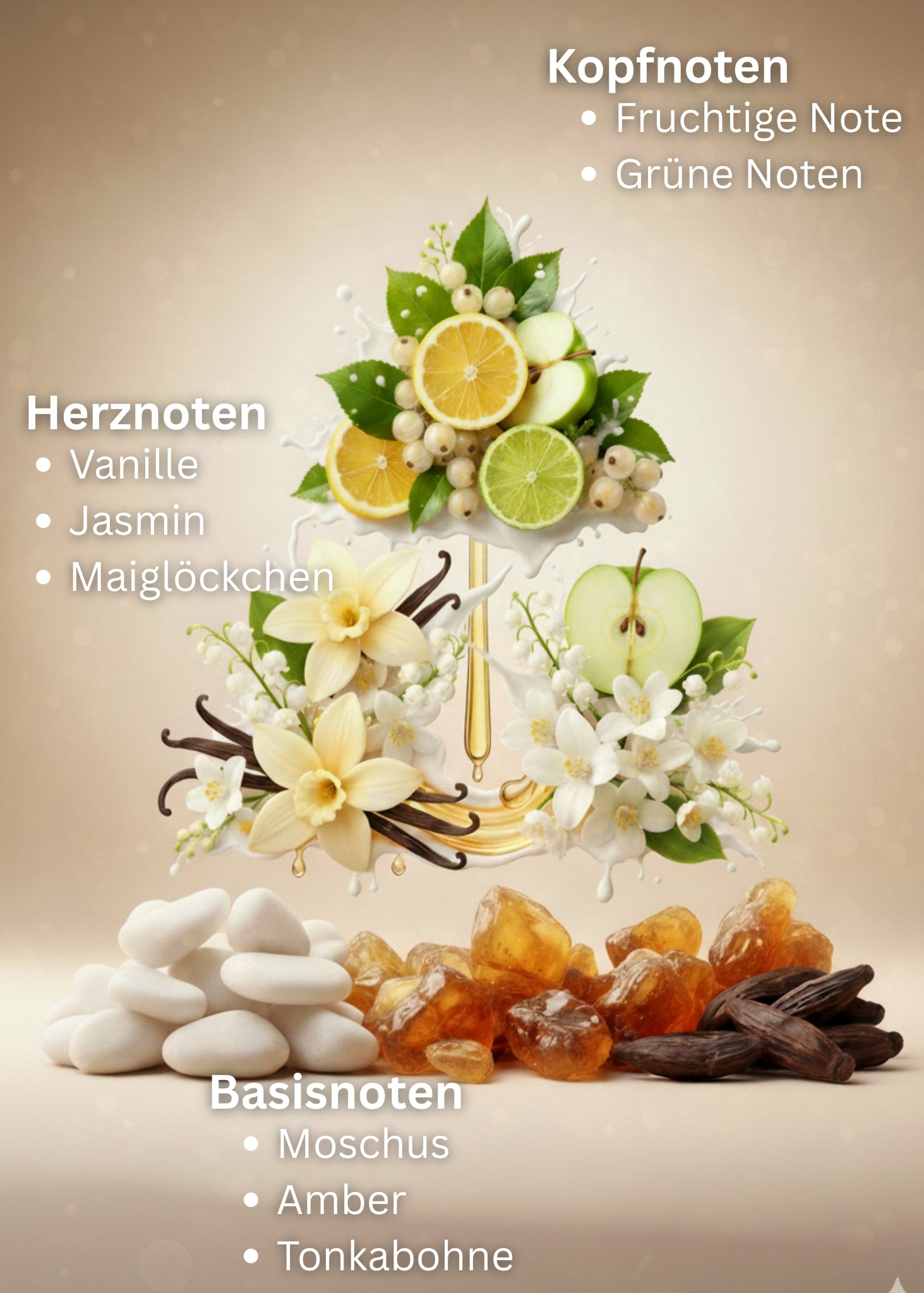 Herznote: Vanilleblüte, Jasmin und Maiglöckchen – cremig, sanft, mild süß