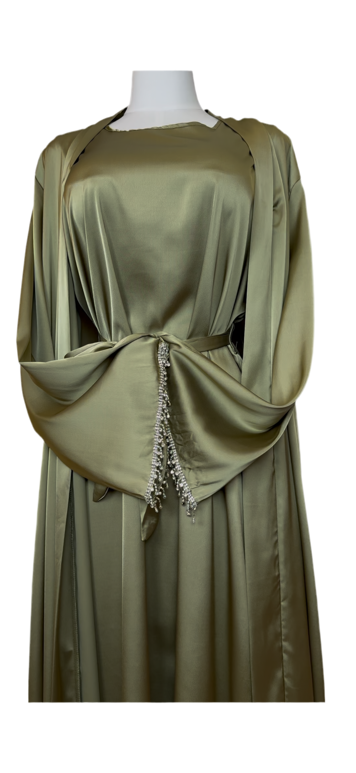 Elegantes Satin 3-Teiliges Offene Abaya Kleid Set Mit Strass Verzierungen - Lemon