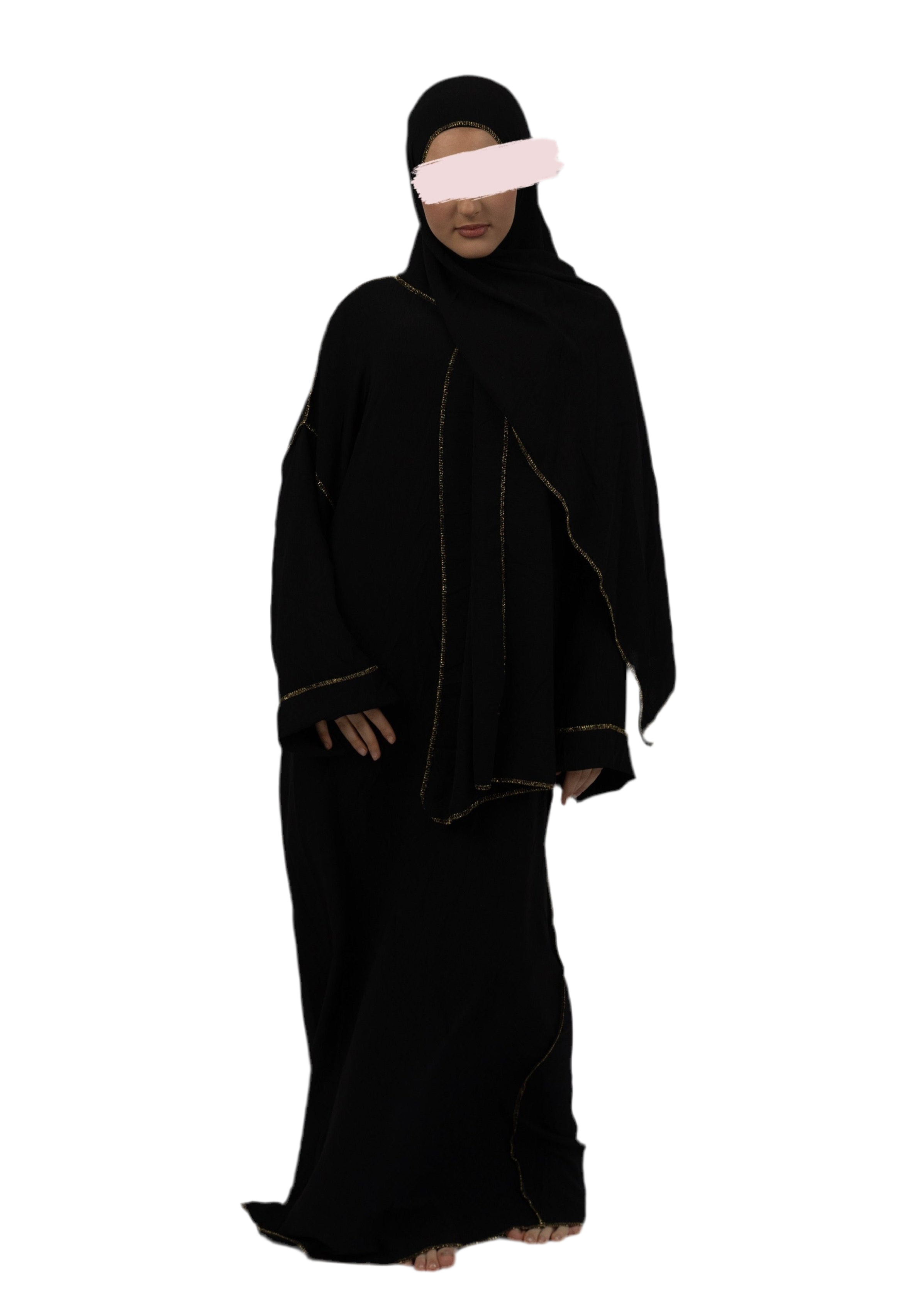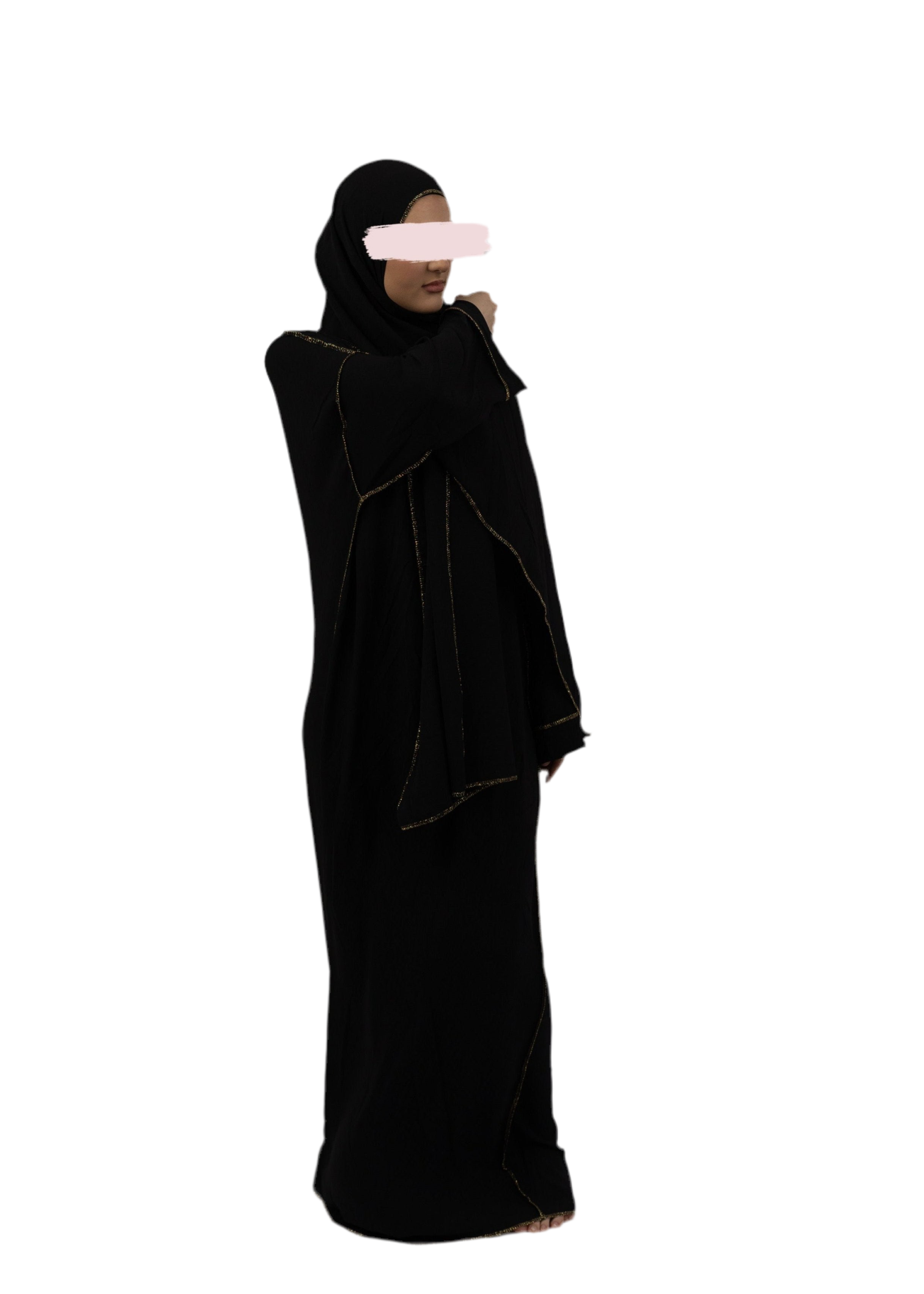 Die goldenen Nähte an den Bund verleihen dem Einteiler einen Hauch von Eleganz, perfekt für den Alltag und zum Beten. Der eingearbeitete Hijab bietet Komfort und eine mühelose, stilvolle Passform.